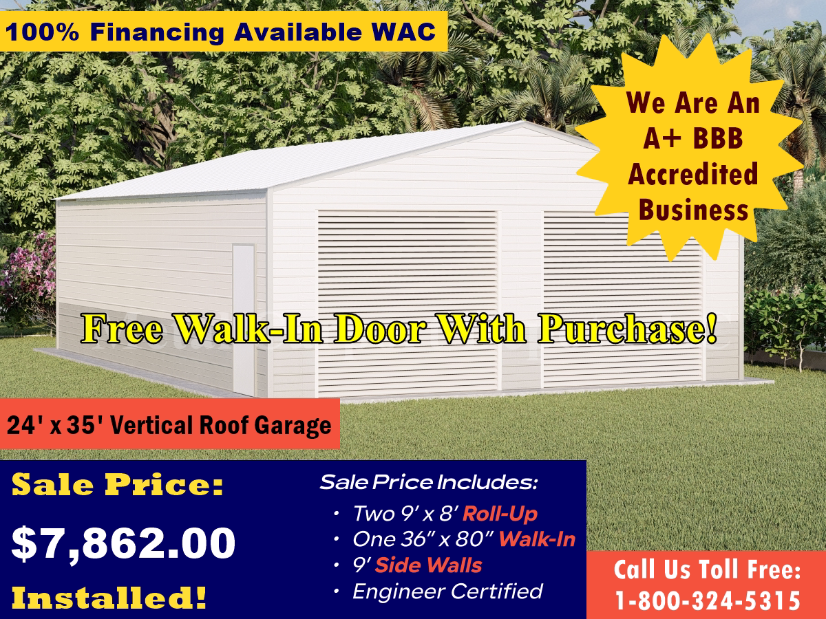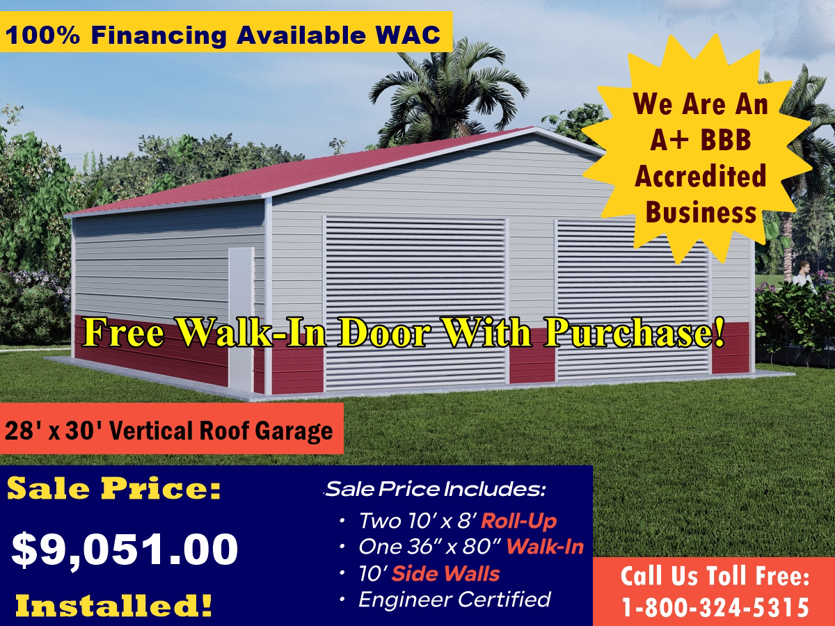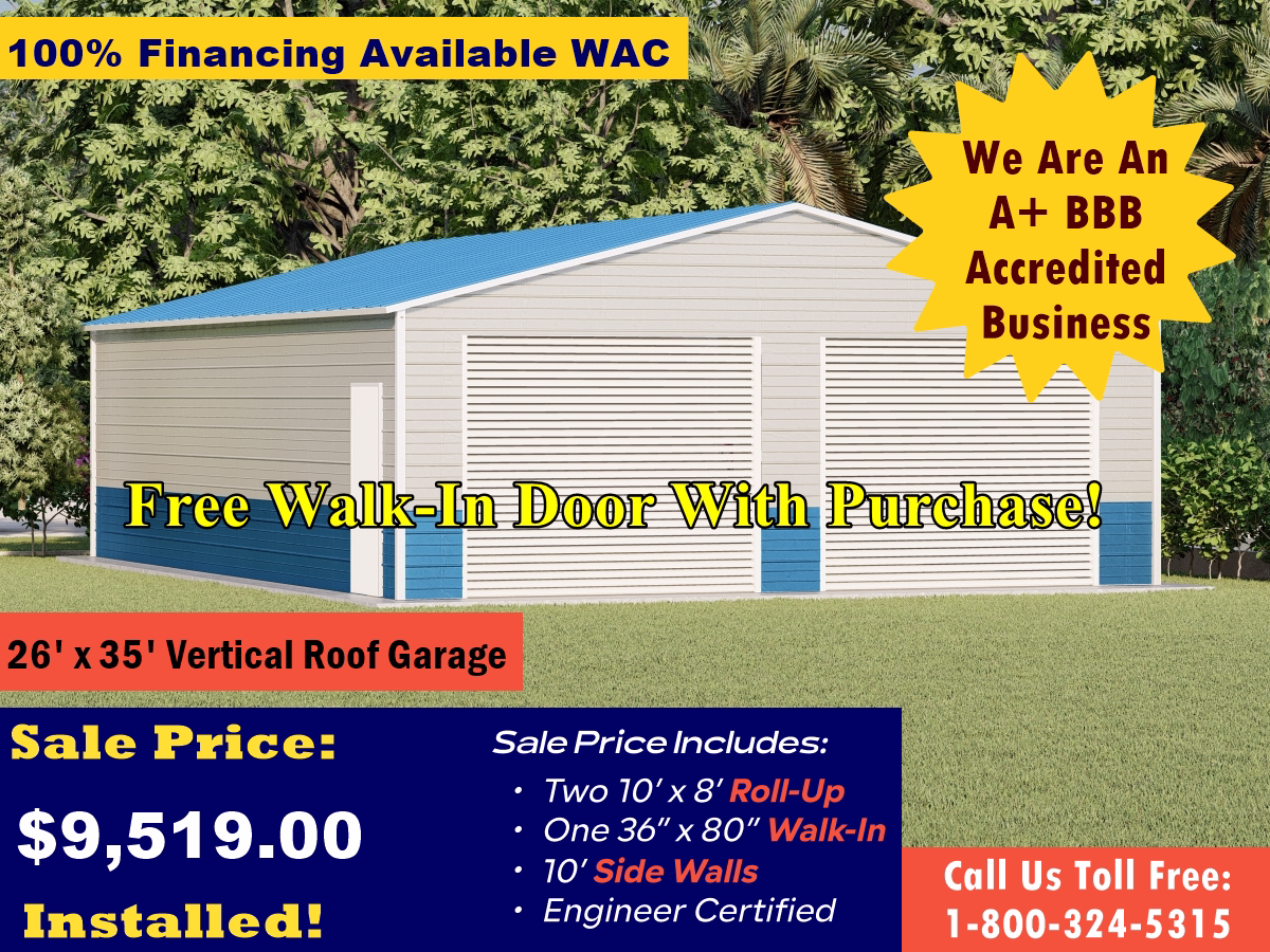 Get 35% Off And A Free $400.00 Walk-In Door With Purchase Of Any Fully Enclosed Garage Priced Over 10K Before The Discount (Ends 12/31/2025). Door Will Be Added To Final Order*.