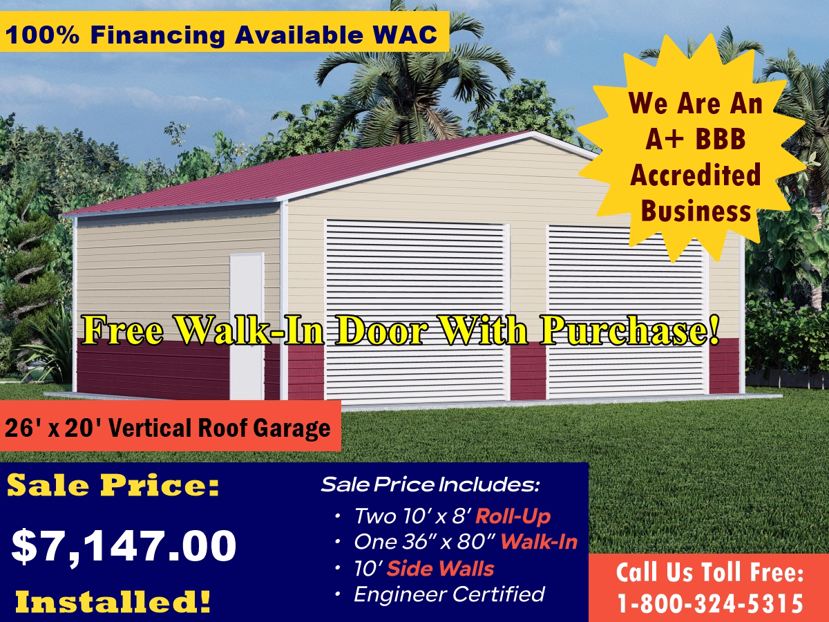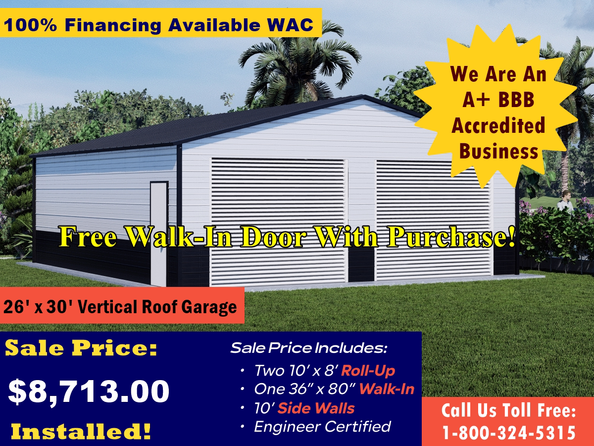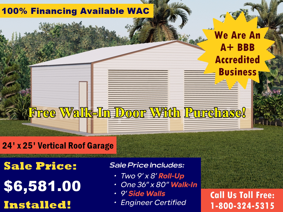 Get 35% Off And A Free $400.00 Walk-In Door With Purchase Of Any Fully Enclosed Garage Priced Over 10K Before The Discount (Ends 12/31/2025). Door Will Be Added To Final Order*.